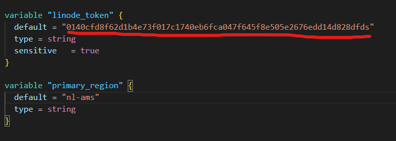Open variables.tf file and paste in your Linode token. If you don't know how to create a Linode PAT, check this article here. It should look similar like the picture. You can also adjust the region while you're here :D